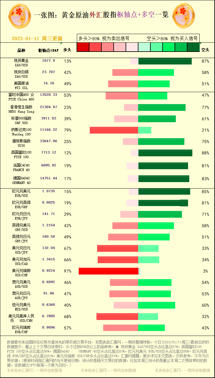 汇通财经APP讯——一张图:黄金原油外汇股指"枢纽点+多空占比"一览。今日(2023/01/11周三)最新出炉的数据显示,截止上个交易日结束时,头寸达到80%及以上的品种有:★