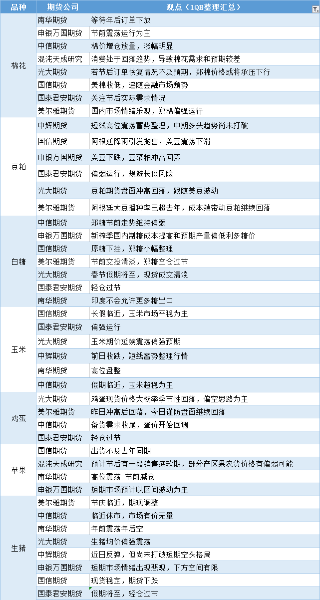 期货公司观点汇总一张图:1月20日农产品(棉花、豆粕、白糖、玉米、鸡蛋、生猪等)