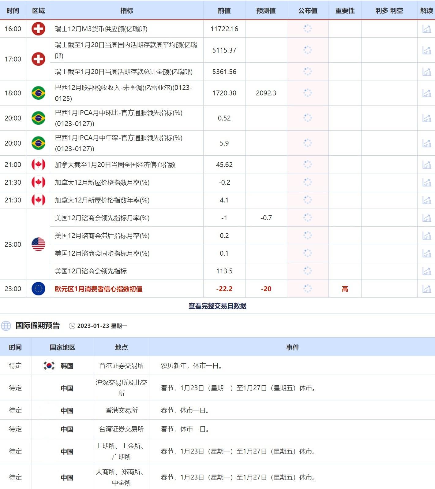 汇通财经APP讯——1月23日(周一),投资者需关注的重点数据:加拿大截至1月20日当周全国经济信心指数,加拿大12月新屋价格指数月率,加拿大12月新屋价格指数年率和欧元区1月消费者信心指数初值。需关注的大事件:日本央行公布2022年12月货币政策会议纪要,欧洲央行管委维斯科发表讲话,日本通常国会开幕,日本首相岸田文雄将就施政方针发表演说。此外还需关注中国和韩国的休市公告。