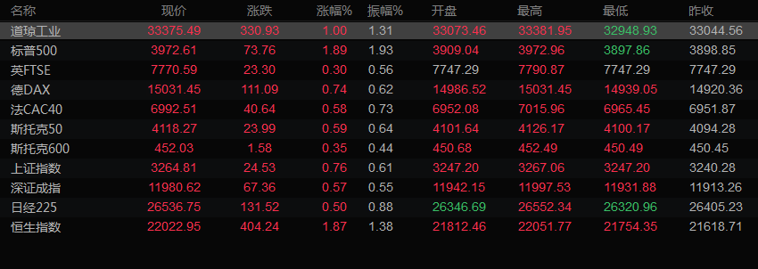 标普500指数上涨1.89%,至3972.61点;纳斯达克指数上涨2.66%,至11140.43点。