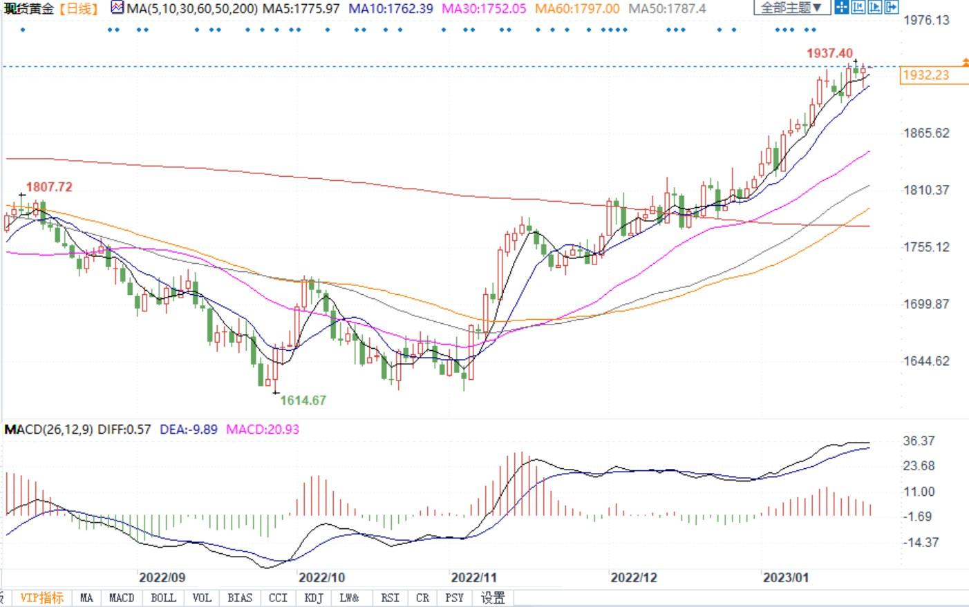 现货黄金震荡微涨,目前交投于1932美元/盎司附近。周一现货金价维持窄幅震荡,多头在经历了五周的上升趋势后稍作喘息,收涨0.23%,报1930.92美元/盎司。