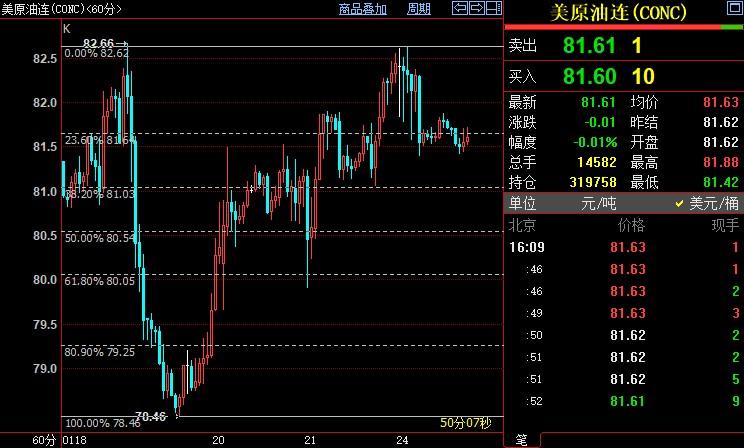 北京时间16:10,NYMEX原油期货下跌0.02%至81.60美元/桶。