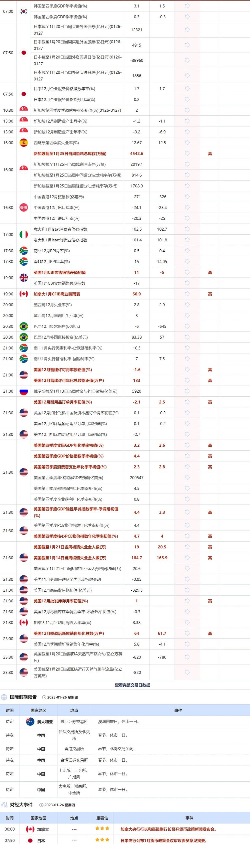 当天还需要关注日本央行1月货币政策会议审议委员意见摘要,以及澳大利亚和中国各大交易所的休市公告。