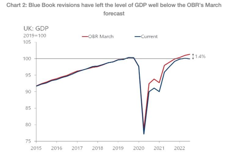 如下图所示,蓝皮书的修正导致英国GDP低于牛津经济研究院3月份的预测