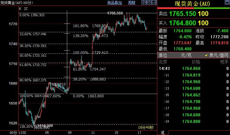 现货黄金下跌0.44%至1765.73美元/盎司;COMEX期金主力合约下跌0.39%至1768.9美元/盎司;